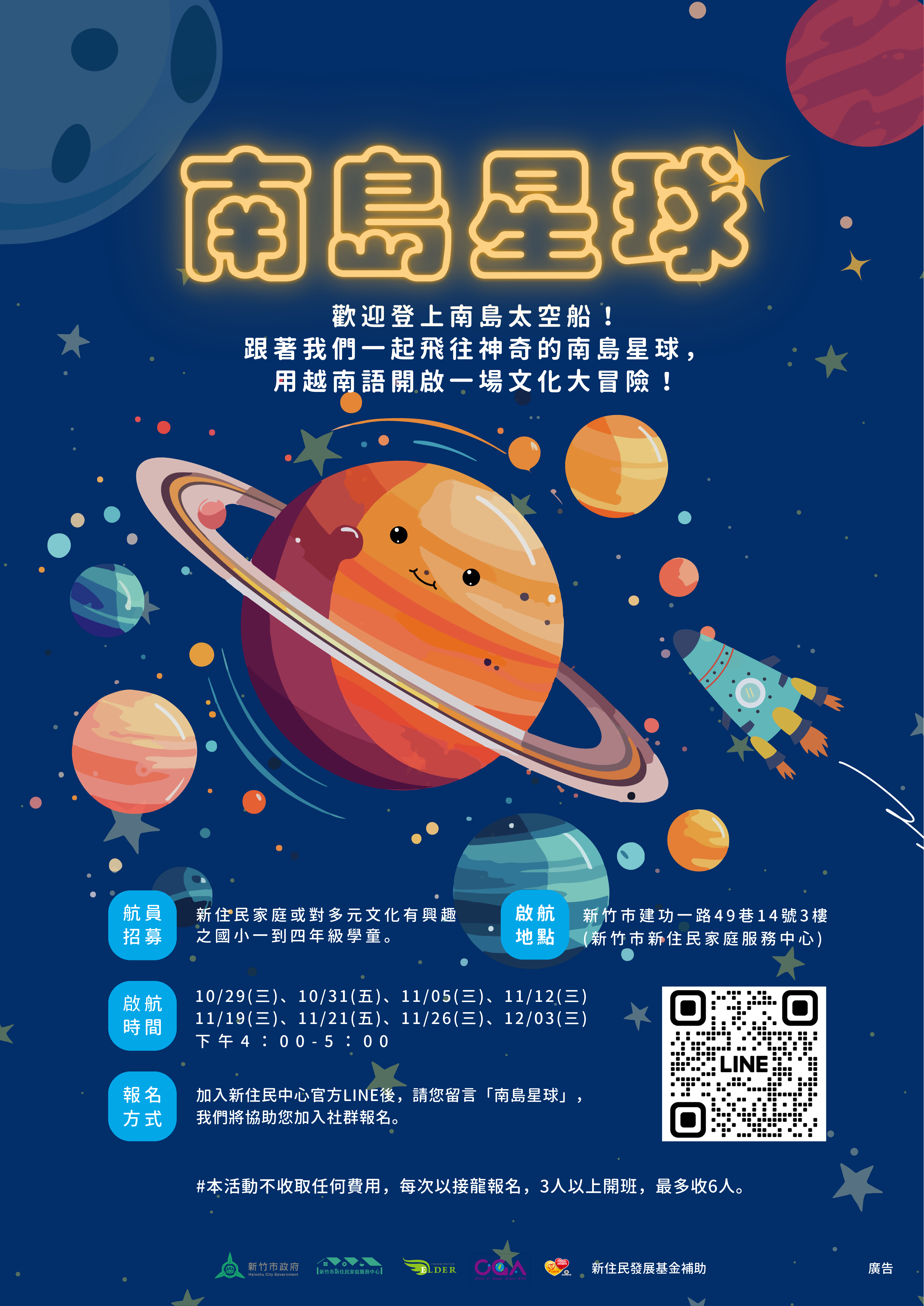 加入新住民家庭服務中心官方LINE帳號,留言「南島星球」,我們會協助您加入報名群組。每次活動以接龍方式報名,3人以上即可開班,最多6人,小團體互動更有溫度!