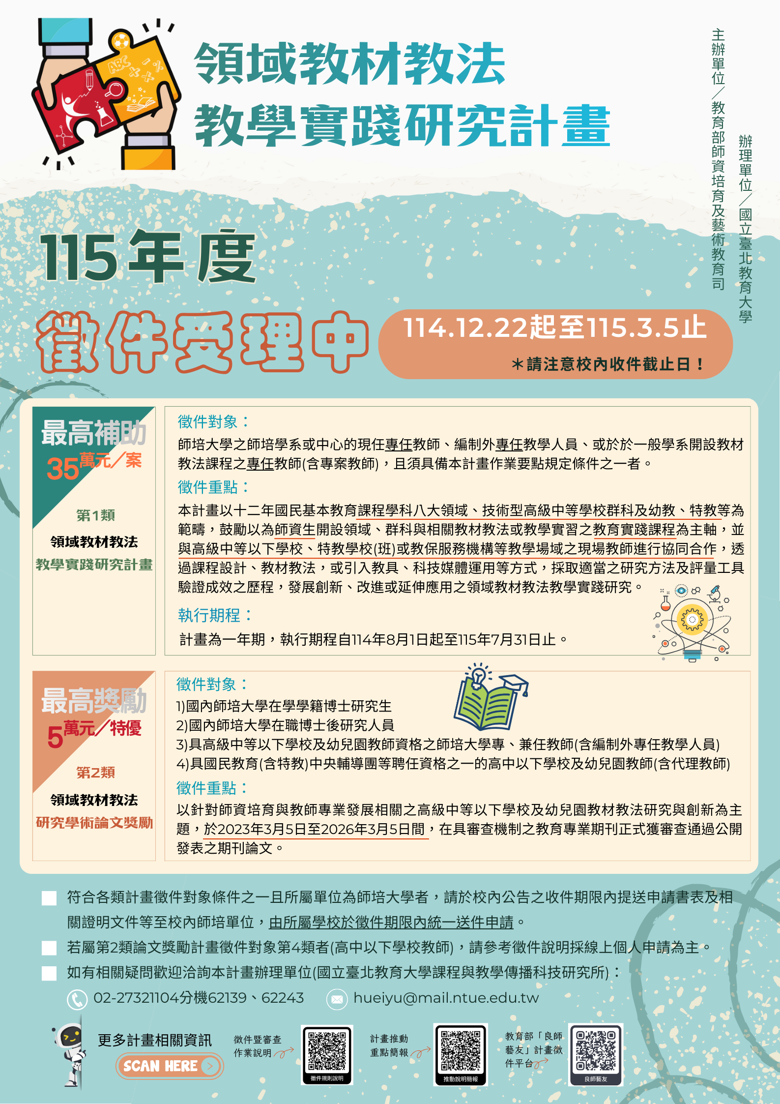 「115年教育部補助師資培育之大學領域教材教法教學實踐研究計畫」第2類計畫─「領域教材教法研究學術論文獎勵」申請作業