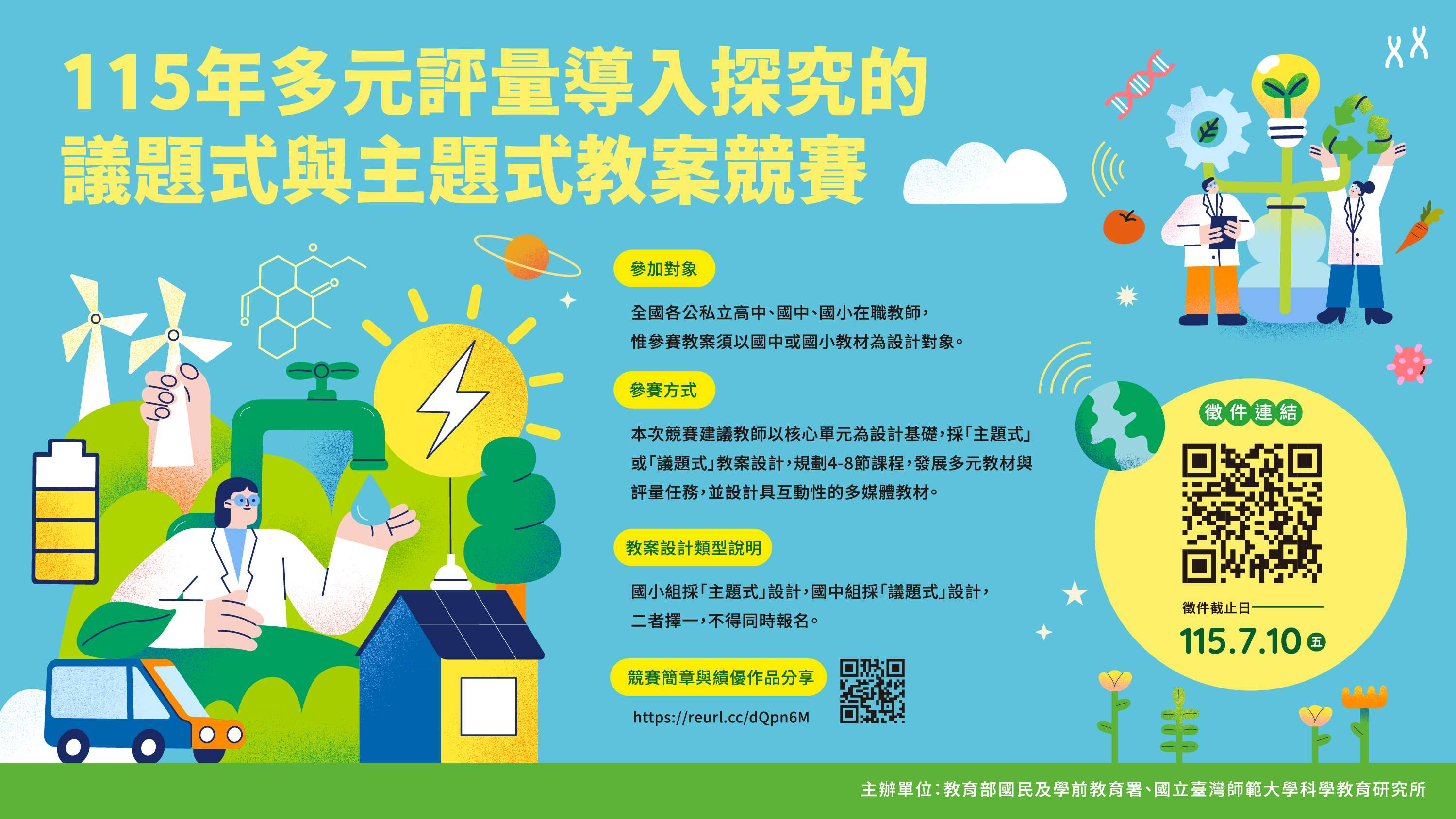 國立臺灣師範大學執行教育部國民及學前教育署計畫,辦理「多元評量導入探究的議題式與主題式教學教案」競賽徵稿