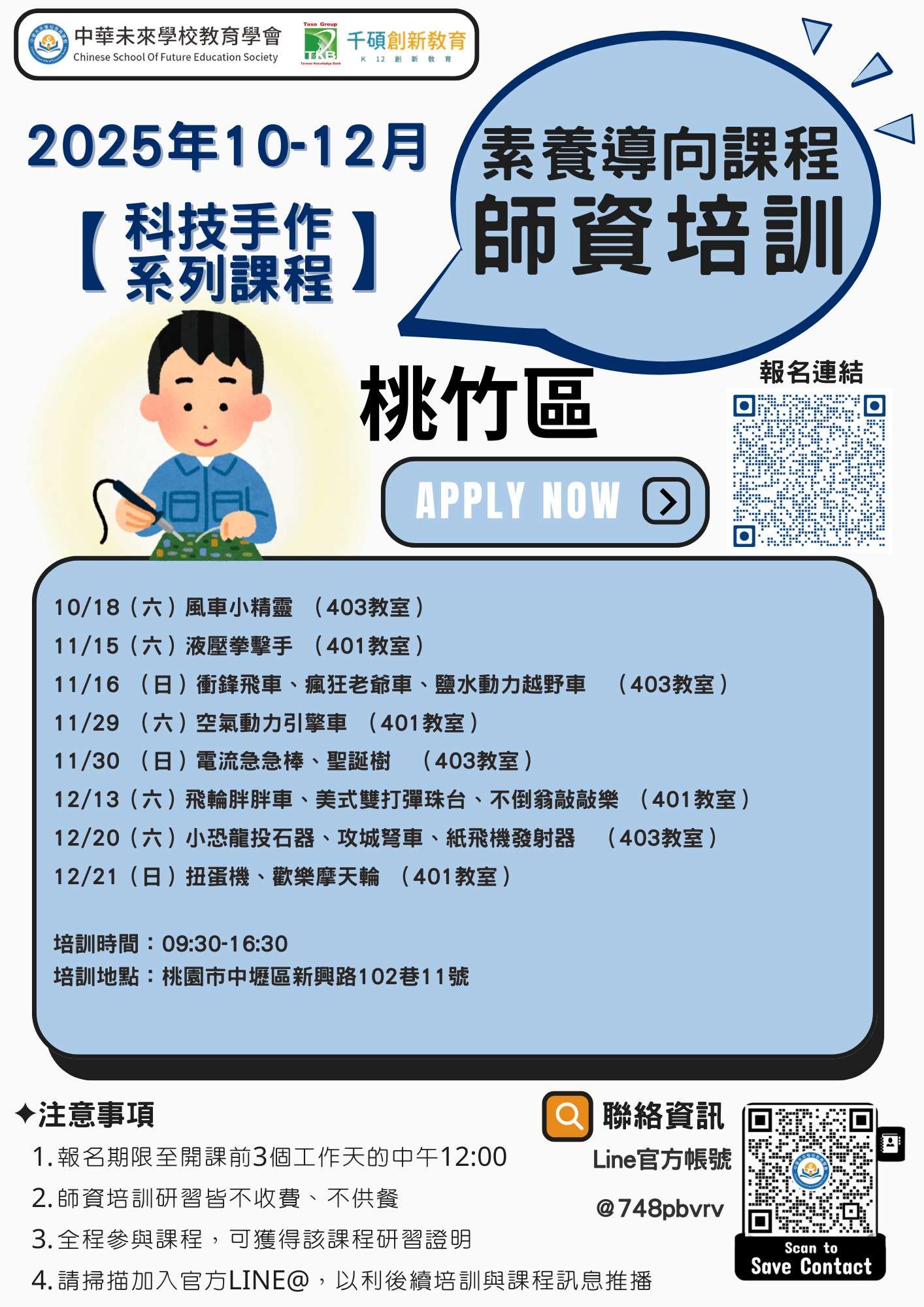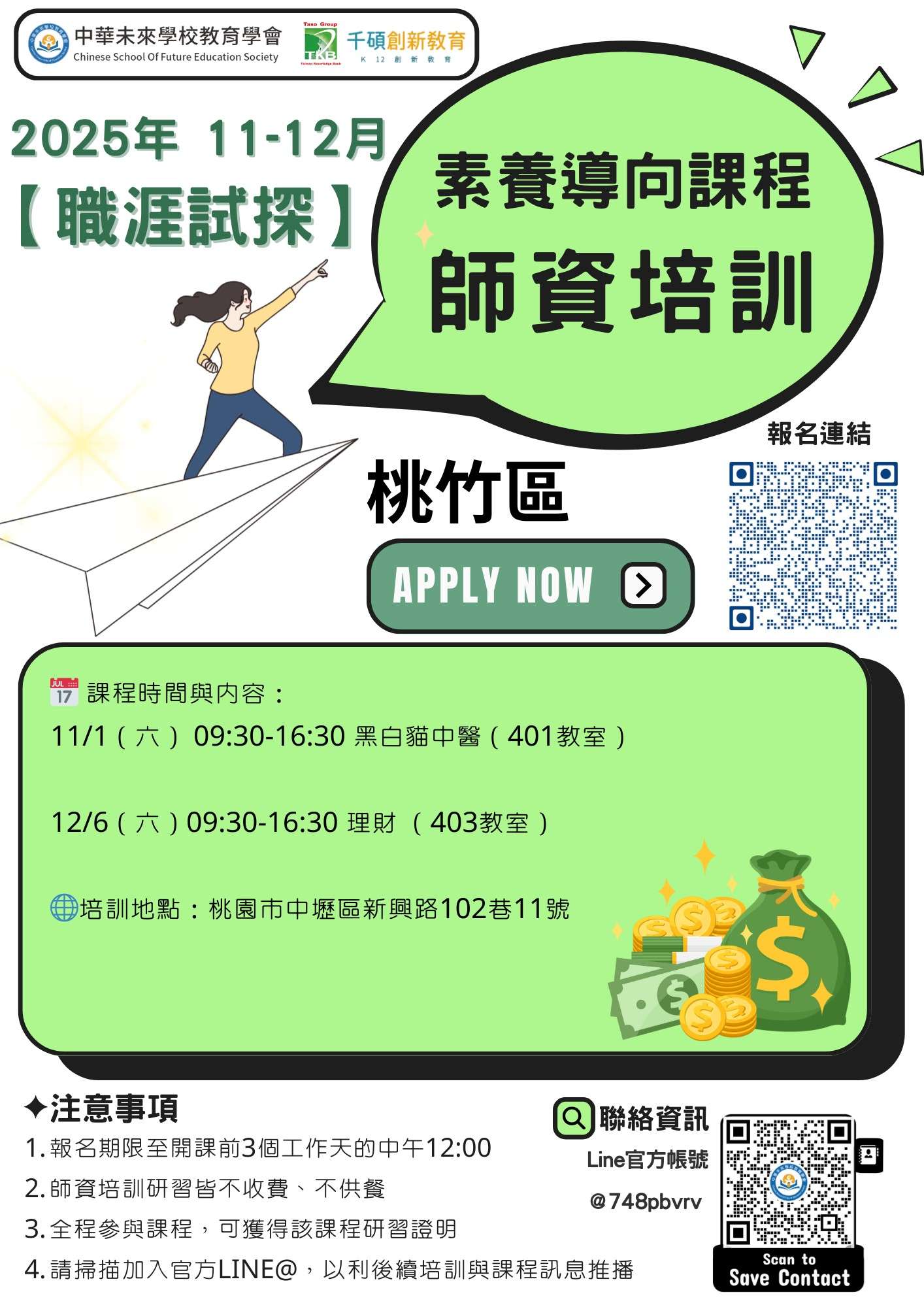 二、研習規劃培訓領域,包含職涯試探領域:中醫、理財,科技素養領域:科技手作,以協助教師精進多元素養教學能力,並拓展教學應用成效,詳見海報資訊。