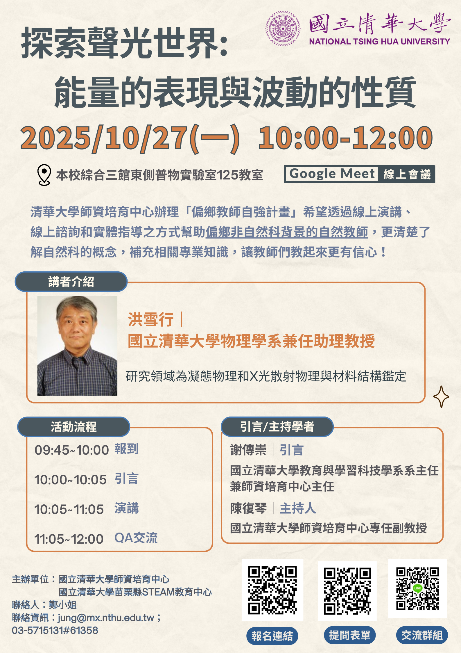 國立清華大學師資培育中心及苗栗縣STEAM教育中心辦理「偏鄉教師自強計畫-探索聲光世界: 能量的表現與波動的性質」線上講座